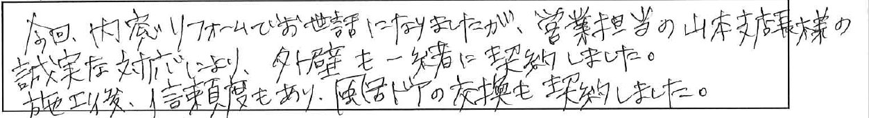 今回は内窓リフォームでお世話になりましたが、営業担当の山本支店長様の誠実な対応により、外壁も一緒に契約しました。施工後、信頼度もあり、風呂のドアの交換も契約しました。