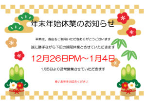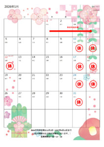 年末年始と2026年1月の営業日のお知らせです。